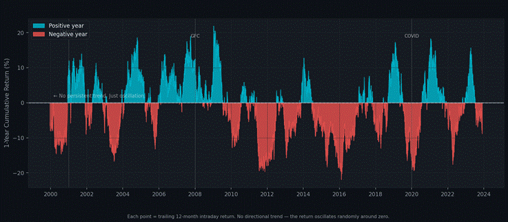 Chart 4 · 1-year rolling intraday return. No directional trend - just noise oscillating around zero.