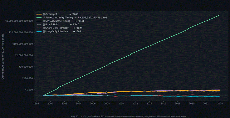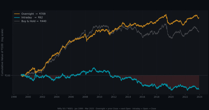 This analysis covers Nifty 50 data from 1999 to 2025. The overnight effect is consistent with similar analyses on the S&P 500, FTSE, and other major indices - it is a structural feature of public markets globally, not an India-specific quirk.