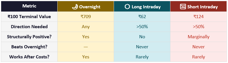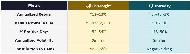 The overnight gap alone - a window when markets are closed and you literally cannot trade - generated the overwhelming majority of Nifty’s long-run gains.