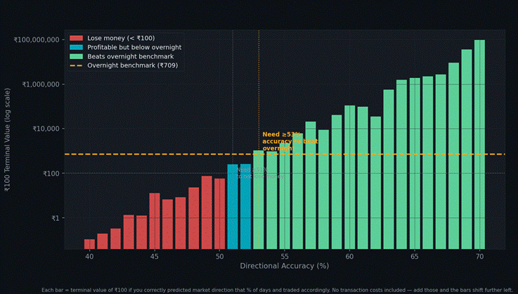 This is where the analysis gets genuinely humbling. We modelled intraday returns at every directional accuracy level from 40% to 70% - and tracked what ₹100 became over 26 years.