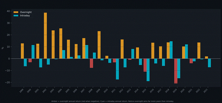 The consistency of the overnight edge across 26 calendar years is not luck. It is structure.