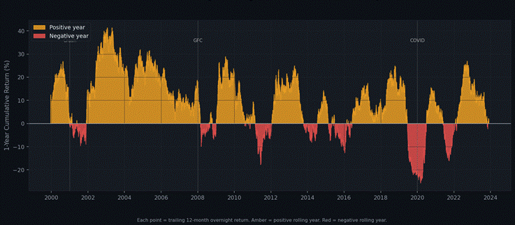 Chart 3 · 1-year rolling overnight return. Amber = positive year, Red = negative year.