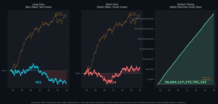 Now flip it. What if you had invested ₹100 in 1999 and captured ONLY the overnight returns - buying at the previous close, selling at the next day’s open?