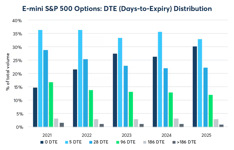 Data from the CME Group shows how quickly short-dated options have grown. Four years ago, options with 0–5 days to expiry in E-mini S&P 500 contracts averaged around 350,000 contracts daily, while 0DTE volumes alone grew from roughly 100,000 to around 370,000 contracts in that period.
